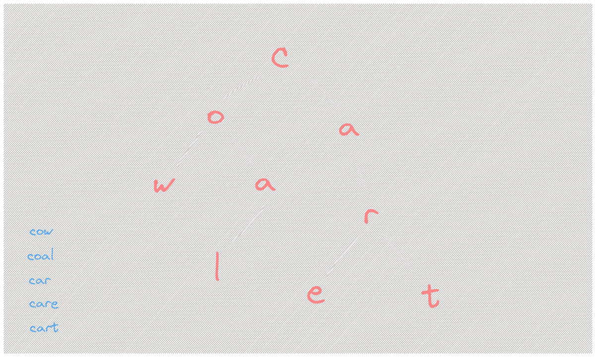 into a trie. We begin at the root node and check if its children contain a node for the character c